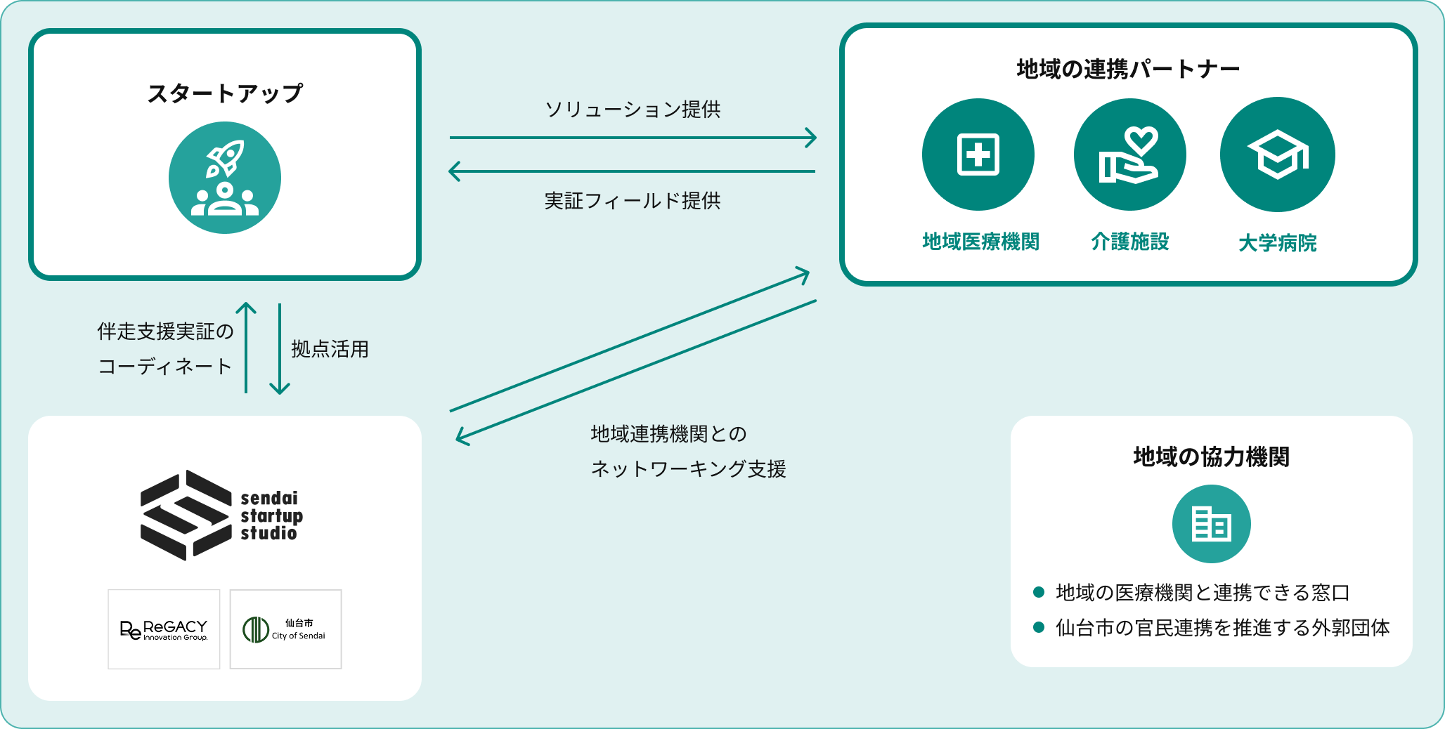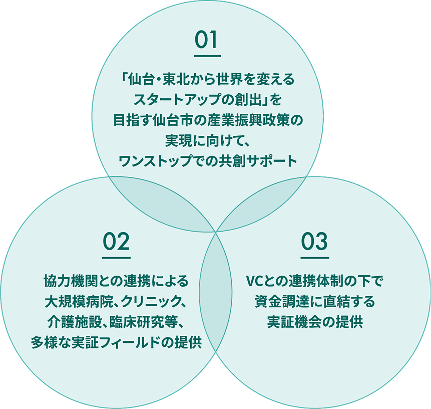 仙台市関連部署や地域医療機関、介護施設、VC 等との密な連携のもと、仙台市内の医療機関や介護施設等での実証・実装を通じて、全国で活躍できるスタートアップを輩出します。